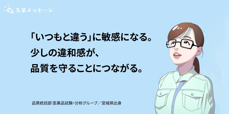 アイボンやアンメルツの製造現場の環境モニタリングや、製品の菌試験を担当しています。医薬品の製造現場は、製品への微生物汚染等が起きないような環境の維持・管理が求められます。環境モニタリングを行うことで、現状を把握して評価し、汚染リスクを未然に防ぐことや、適切な製造環境であることの保証につながります。品質管理を担う立場として、お客様視点で考え、安心と安全を届けられるように努めています。